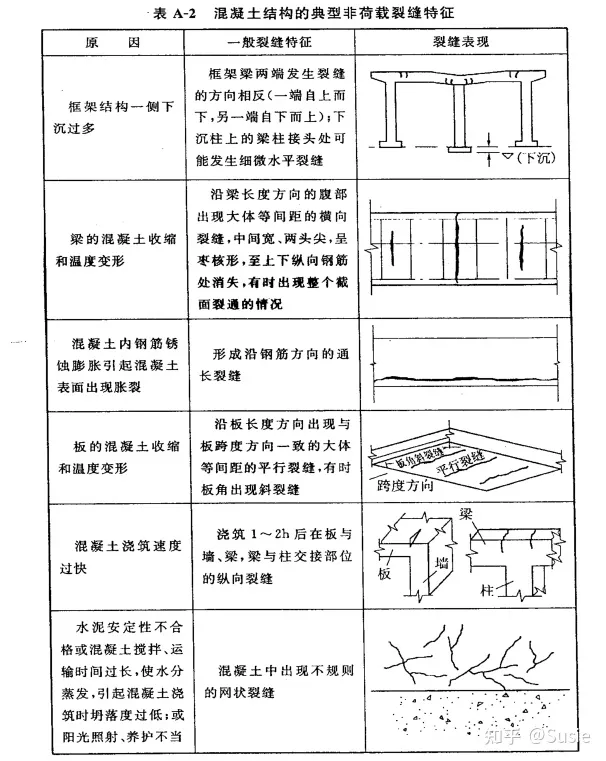 1. 荷載引起的叫荷載裂縫;典型荷載裂縫特征詳表A-1(源自CECS 293-2011)。2.非荷載因素引起裂縫叫非荷載裂縫(主要原因為溫度、收縮、膨脹、不均勻沉降等);典型非荷載裂縫特征詳表A-2(源自CECS 293-2011)。