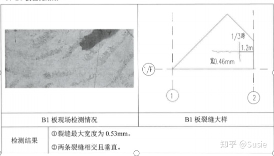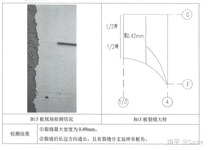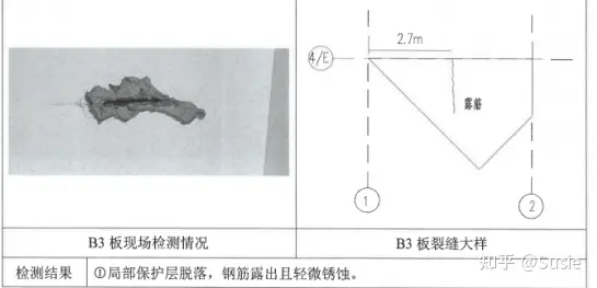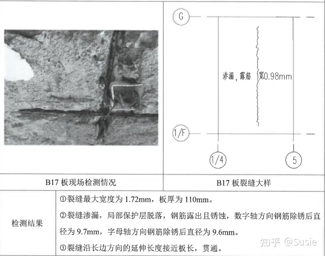 目前發(fā)現(xiàn)該車間屋面板存在裂縫、滲漏,鋼筋銹蝕等現(xiàn)象。板裂縫、鋼筋銹蝕及相關(guān)檢測結(jié)果詳圖1。